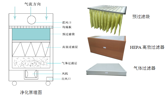 煙塵廢氣通過吸煙管/吸煙口進(jìn)入凈化機(jī)內(nèi),首先經(jīng)過均流板導(dǎo)流,使煙塵廢氣均勻通過過濾層,確保濾芯每一部分都得到有效利用。 預(yù)過濾層對(duì)煙塵廢氣中較大的污染粒子進(jìn)行有效攔截,延長(zhǎng)主過濾器的使用壽命。主過濾層對(duì)煙塵廢氣中直徑為0.3微米以上的顆粒的過濾效率達(dá)到99.99%以上。 氣體過濾層選用浸漬型活性炭加分子篩及氧化劑做吸附劑,能對(duì)煙塵廢氣中有害的化學(xué)性氣體進(jìn)行有效的吸附。